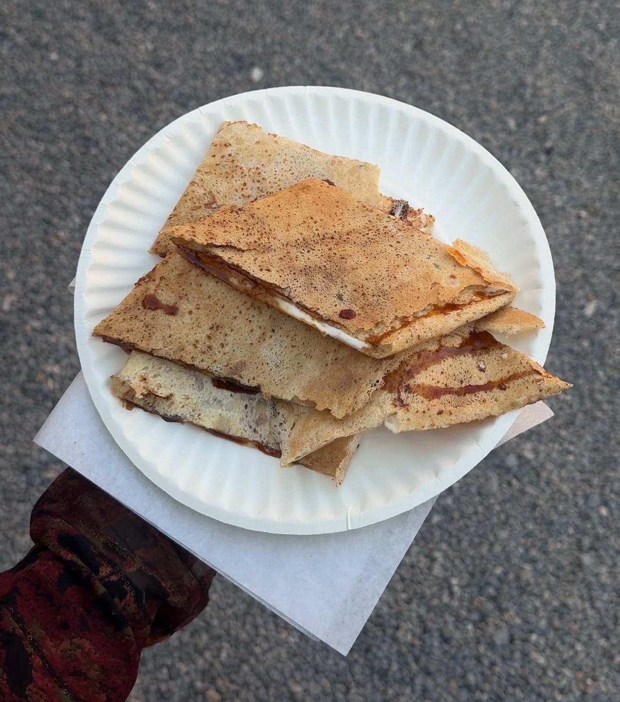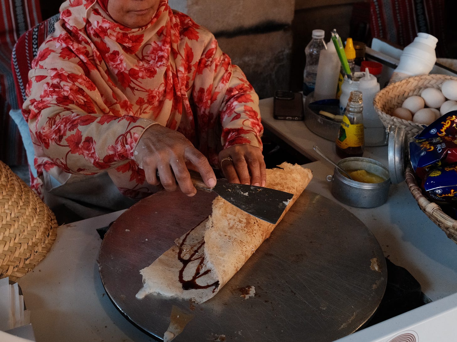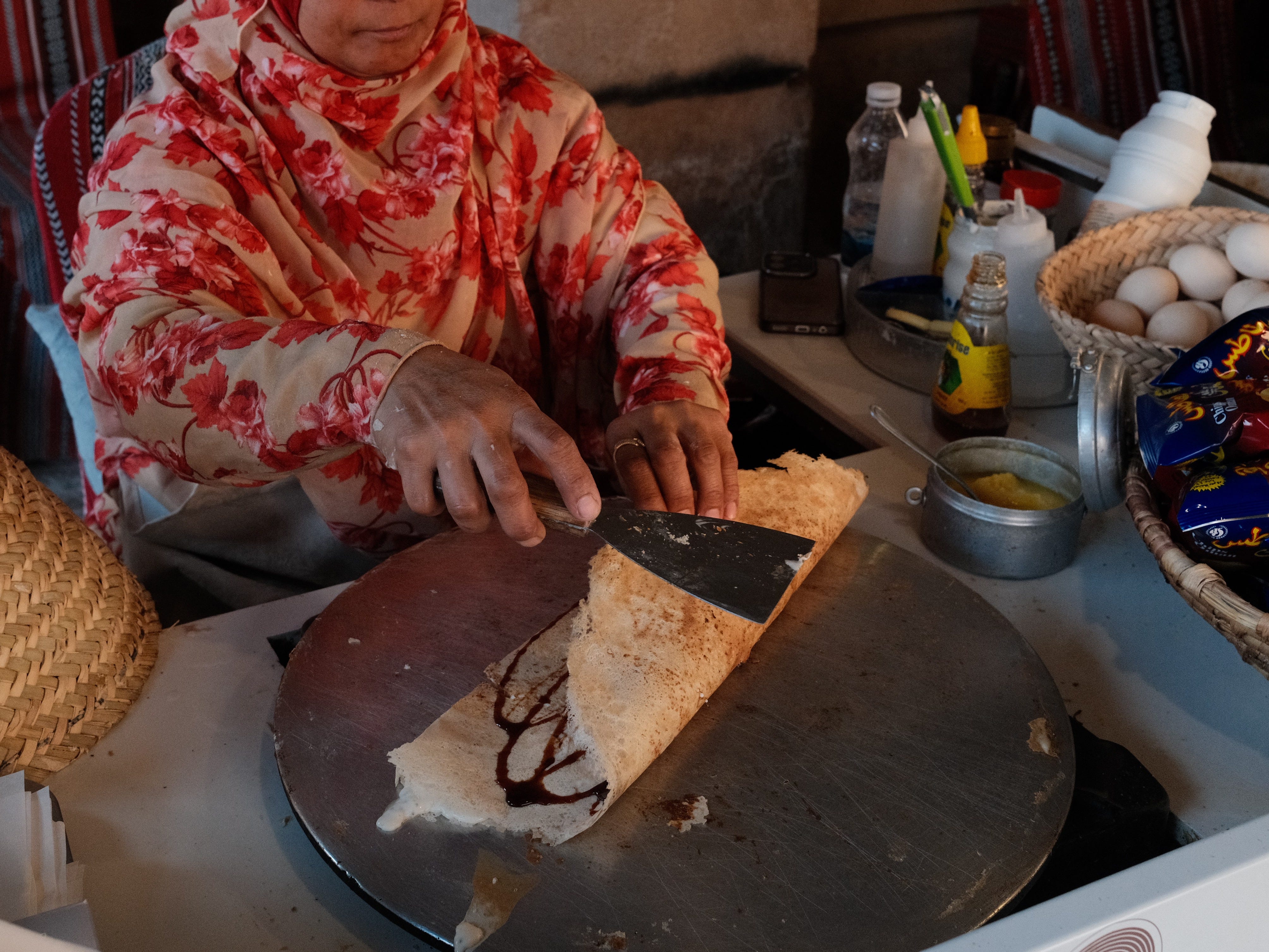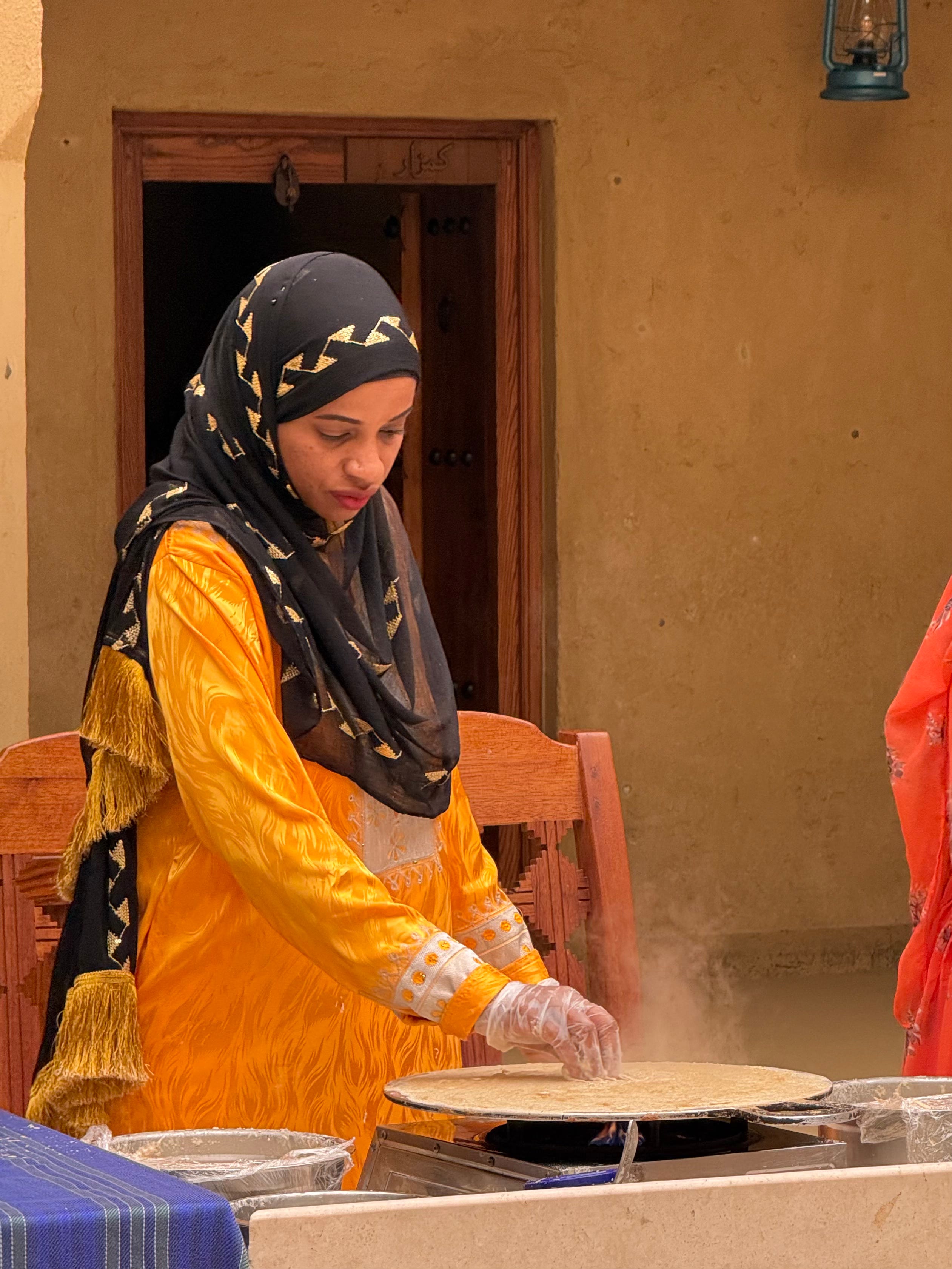 In the old city of Nizwa, I saw a man eating the same dosa-like khubz off a paper plate and asked him where he got it from. He pointed to a stall behind me and after a few minutes of conversation, walked over with me and generously treated me to one himself. He ordered it for me “the traditional way”, folded in a briny and stretchy cheese and local sidr honey, and drizzled with date molasses. We eat it while walking around Nizwa Fort.