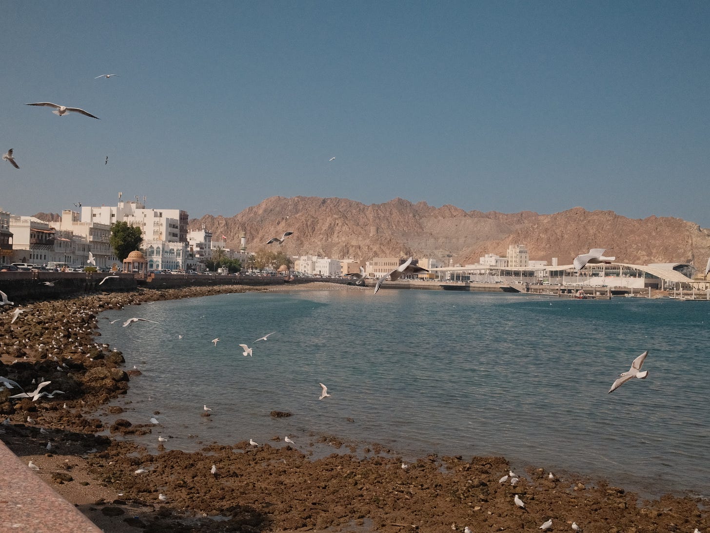 The next morning, we had an unassuming brunch: fresh carrot-orange juice, karak chai, and, local shawarma—this was served to us in a paratha, another one of the many ways that Arab and South Asian cuisine exist in harmony here. The real treat was eating it streetside while Muttrah bustled all around us: taxi drivers milling around the stands with their tea, storefronts shuttering open, cats lurking around in street corners, tourists and seagulls swooping around, and a balmy sea breeze that rustled through it all, signalling a beautiful day ahead.